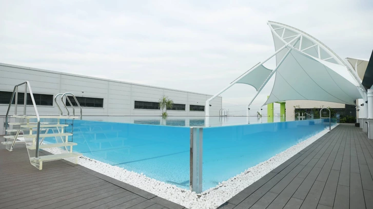 AGIT Global is a professional designer and manufacture for watersport equipment. The swimming pool on the terrace of one of their buildings serves for the product shows and company event venue. That´s why transparency and clearance are of utmost importance for the material selection.