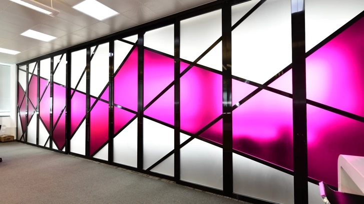 Another highlight in the building is the function hall with a view on the 5th Floor. Or, to be more specific, the spotlight shines on the automatic door made of PLEXIGLAS®. The spectacular 13*4 m door features a ‘dragon’ in a combined form of Evonik Deep Purple and white, the primary corporate color. With one simple touch, the door in front of you unfolds slowly a picturesque view of the neighborhood in the Xinzhuang Industry Park. You can’t help wondering if it were a gallery rather than a meeting hall.