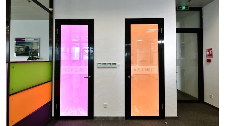 PLEXIGLAS® may have been known for applications in shop-fitting, such as the lightshow facade of Victoria’s Secret’s flagship store in Shanghai. Yet, has anyone ever thought of a lightshow for the everyday office? Employees at Evonik are quite amazed by the newly installed phone booths with color-changing doors. Fitted with LEDs along the edges, the light panel made of PLEXIGLAS® Endlighten T can distribute the light evenly so that the whole door looks like a uniformly illuminated painting. Thermal sensed LEDs make it also very interesting that when a colleague enters the booth, the LEDs are lit and start changing colors as the person walks around in the booth.
