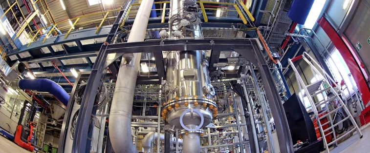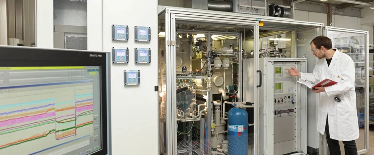 The synthesis module came on stream at Evonik in spring 2019. At its heart is an 8-meter high stainless steel bioreactor with capacity of 2,000 liters. Microorganisms work continuously in the reactor. Their main nutrients are hydrogen and carbon monoxide. Siemens has developed a fully automated CO2 electrolyzer which was integrated into a container in summer 2019. The world's first CO2 electrolyzer comprises 10 cells and the total surface area of the electrodes is 3,000 cm2.