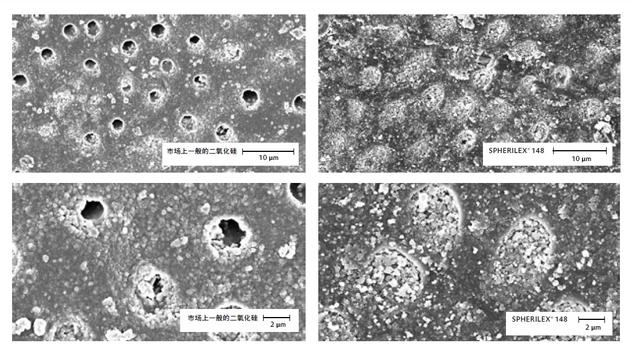 小管阻塞性能对比图,市场上一般的二氧化硅(左图) vs SPHERILEX®148(右图)